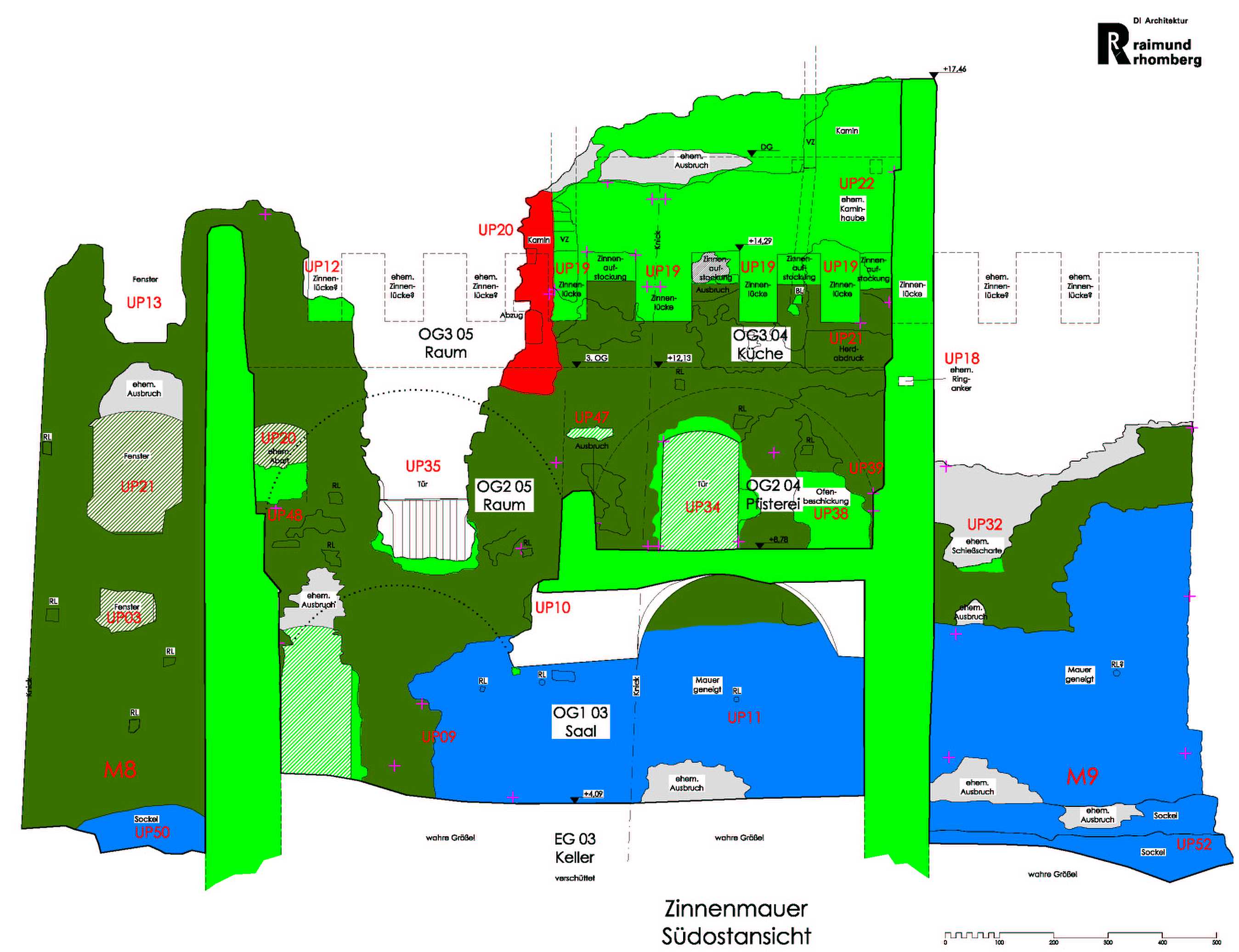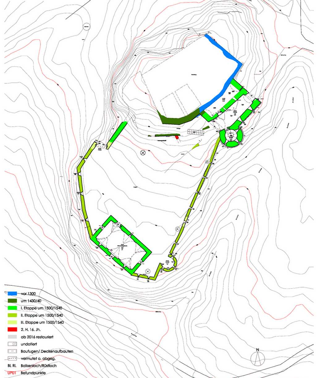 | Schloss Aichelberg, Wernberg, Schnitt Zinnenmauer außen | Schloss Aichelberg, Wernberg, Südwestansicht Wirtschaftsbau | ||||||||||||||||||||||||||||||||||